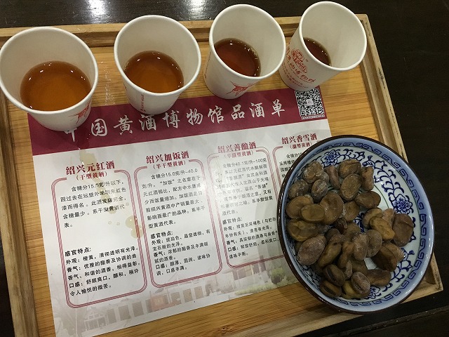 名物の乾燥ソラマメと一緒に紹興酒を試飲させてもらいます。