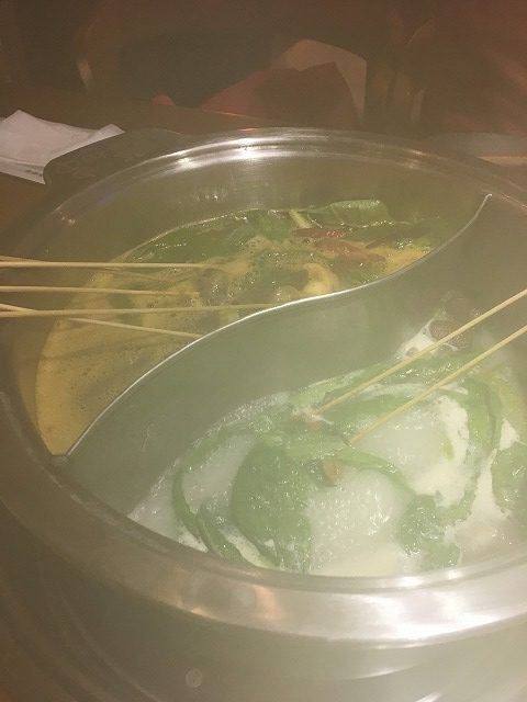 仕方がないので、お客さんの動きを見ていると、とりあえず火鍋が運ばれて来たら串を選んで入れて食べているみたい。